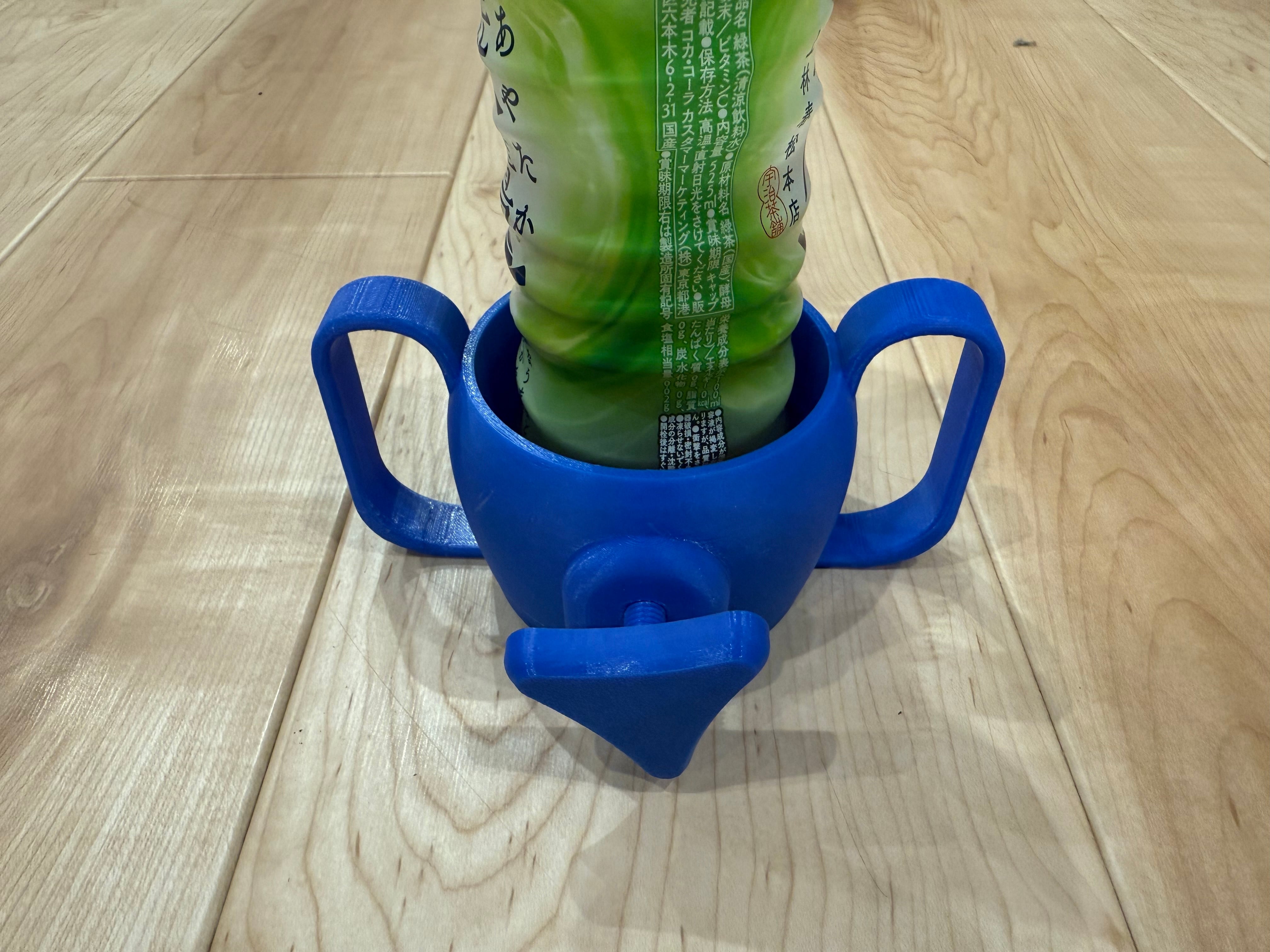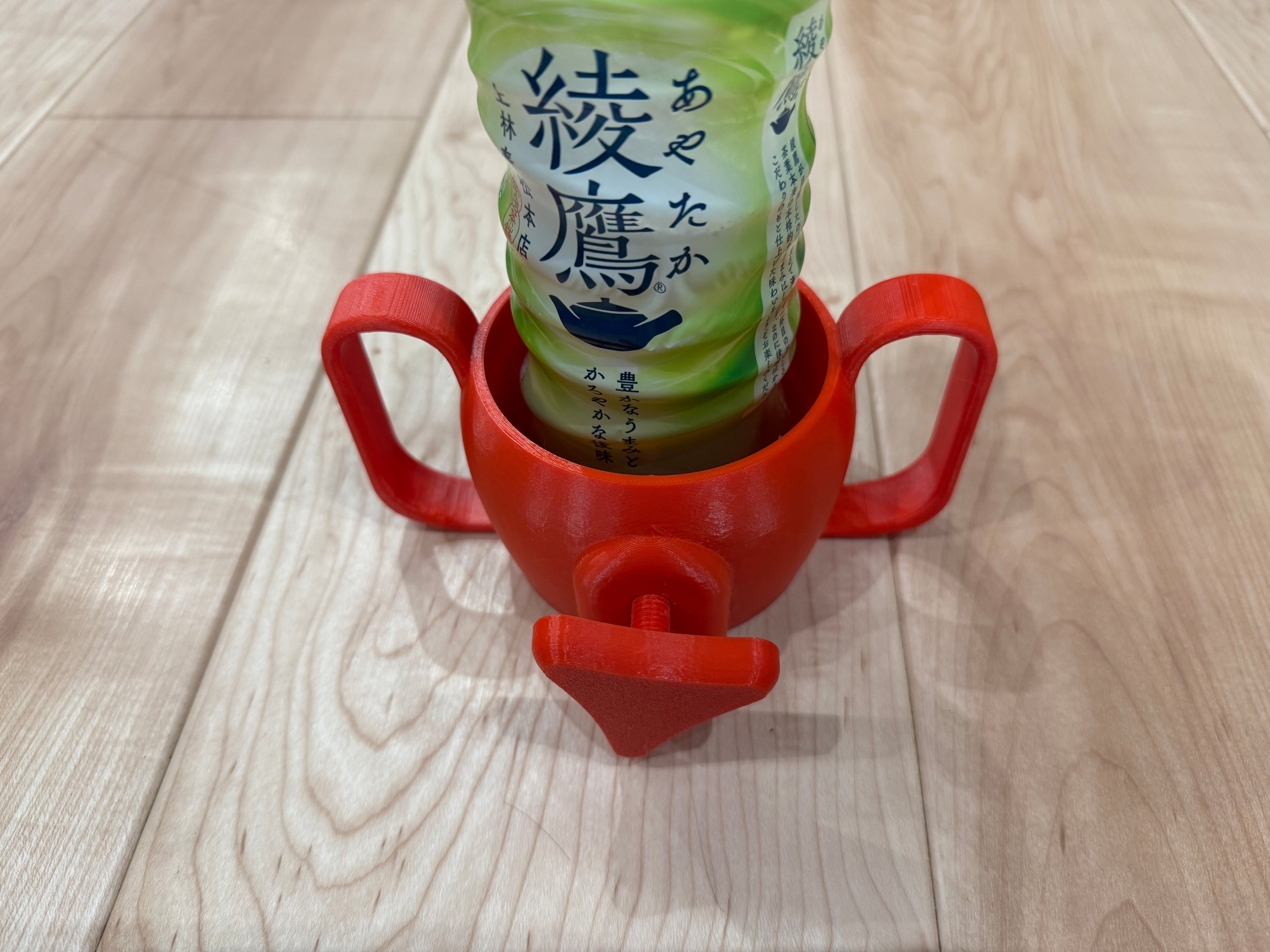 このホルダーは、リウマチや難病などで手の握力が弱い方でも、両手でしっかり持てる設計になっており、500ml〜600mlのペットボトルや一部のカップにも対応しています。